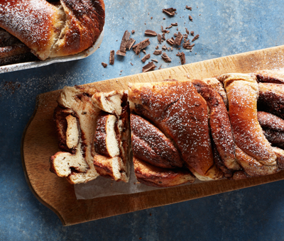 Lækkert, luftigt og spækket med et blødt fyld af chokolade og smør – vores chokoladebrød med kardemomme er en sikker favorit hos både børn og voksne. Det rullede og snoede brød er fyldt med lommer af chokolade og drysset med et tyndt lag flormelis på toppen.