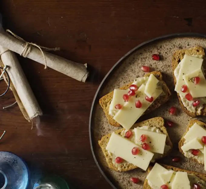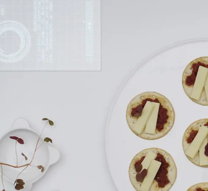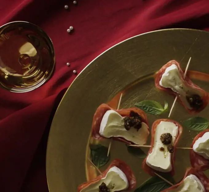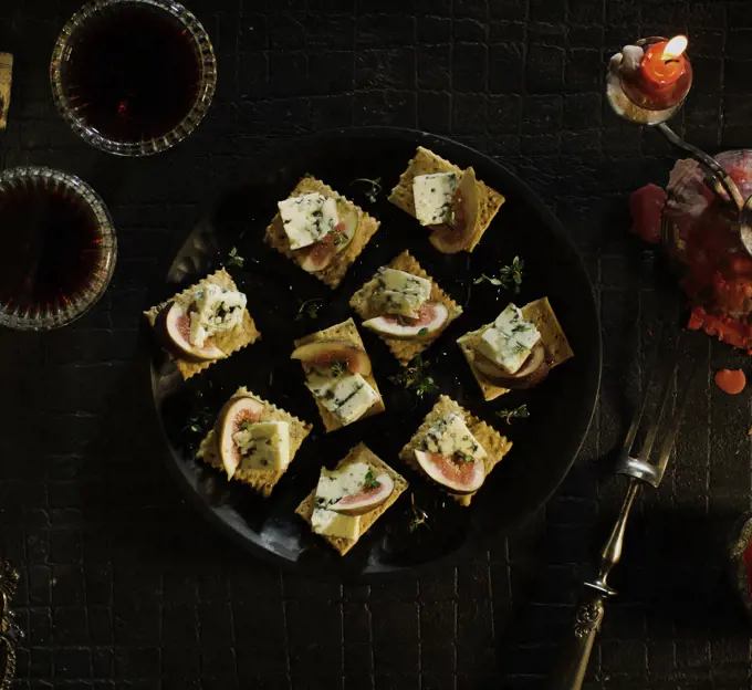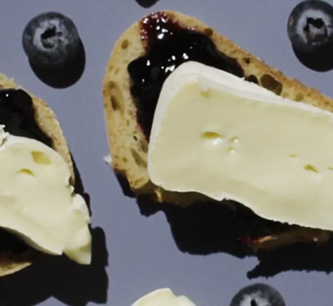 Für zwei Personen brauchen Sie 1 Castello Danablu, 12 Cracker (wenn möglich schwarz), 3 Scheiben Bresola und frische Brombeeren.