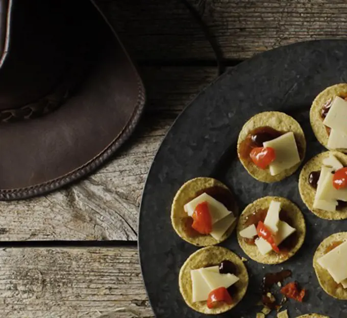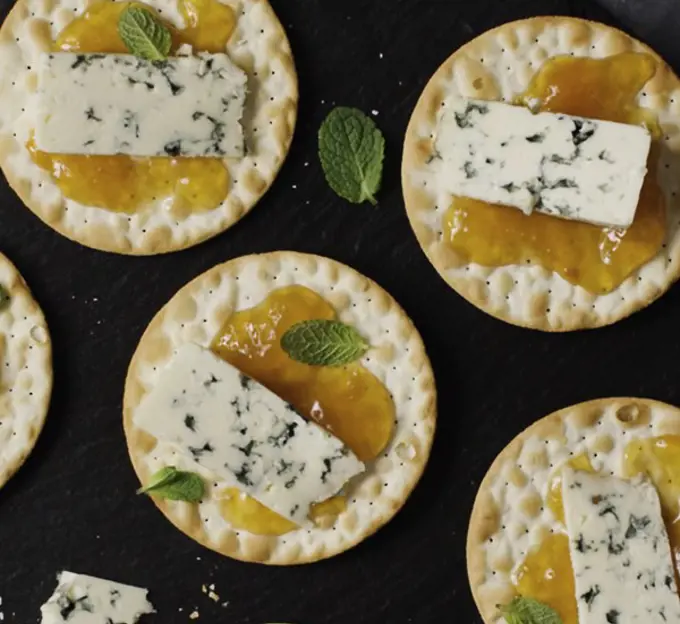 Den Käse für ca. eine halbe Stunde bei Raumtemperatur stehen lassen. Den Käse in kleine Stücke schneiden und zusammen mit dem Bresola auf die Cracker legen. Mit den frischen Brombeeren garnieren.