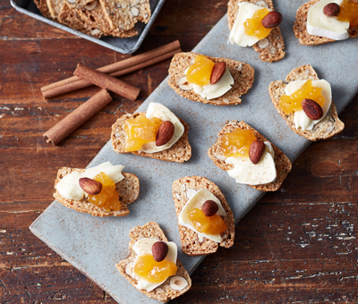 Widerstand ist zwecklos – geben Sie dem Verlangen einfach nach und probieren Sie unseren Weißschimmelkäse mit in Butter gerösteten Zimtmandeln. Perfekt geeignet als Vorspeise oder schneller Snack zwischen den Gängen. Der Käse ergänzt die Aromen aus Nüssen und milden Gewürzen und birgt gleichzeitig einen wunderbaren Kontrast zur dazu gereichten Pflaumenmarmelade. Zum Teilen gemacht!