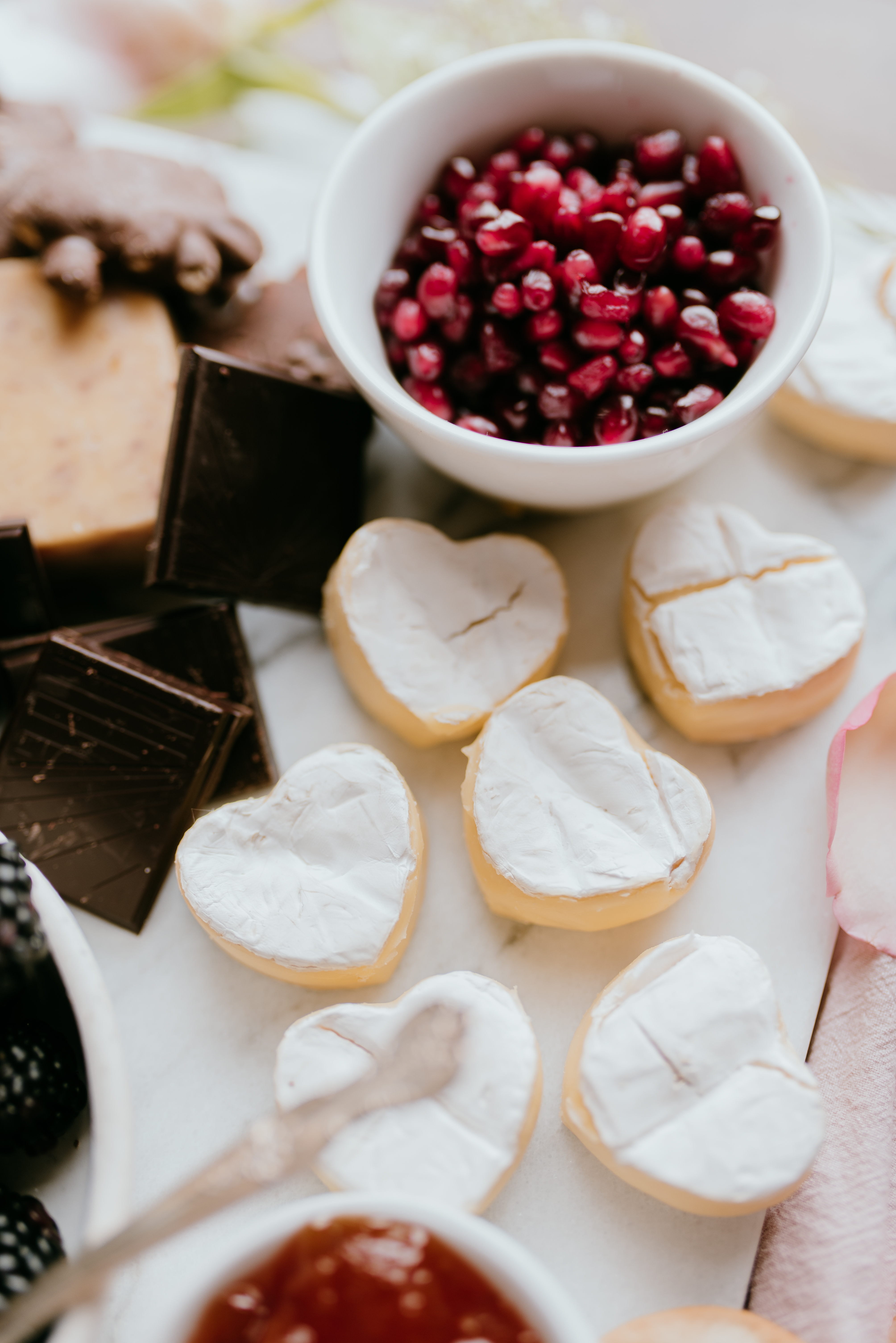 To tailor my cheese and charcuterie board for Valentine’s Day, I added a lot of elements suitable for the occasion! I did a good mix of sweet and savoury, so the board could be our appetizer, main course, and dessert all in one!