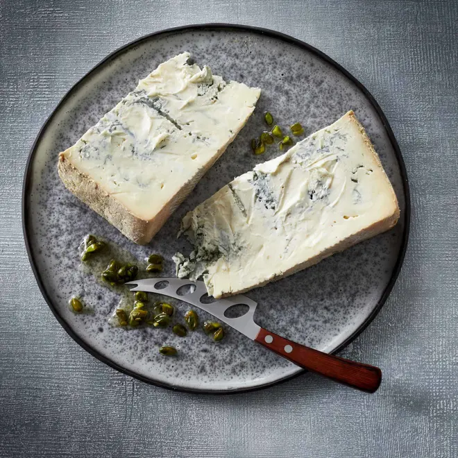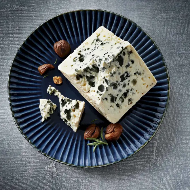 The history of blue cheese goes back to the 7th century, to a cave outside the village of Roquefort in France. Legend has it that a distracted shepherd forgot his lunch of bread and cheese in the cave. When he returned a few months later, the cheese had become infested with penicillium roqueforti, a mould that was growing in the cave. Today this natural mould is refined and used for almost all blue cheeses simply by adding the mould culture to the cheese milk. For the cheese to turn blue, oxygen must reach the inside of the cheese. This is often done by piercing the cheese with thin needles or skewers. The blue mould then matures inside the air tunnels, developing flavour as it ages. Most mould-containing cheeses take 3 to 6 months to mature. In blue cheese, this happens from the inside out.