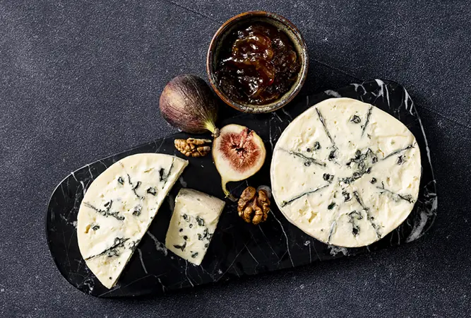 CASTELLO® DOUBLE CRÈME BLUE cheese is a true star in our portfolio. It was invented in Denmark back in 1969 when our talented cheese makers explored bringing together the mild and delicate nature of a brie, with the more intense profile of traditional blue cheeses. DOUBLE CRÈME BLUE is now a classic blue mould cheese type of its own. <br><br>Our DOUBLE CRÈME BLUE range is lusciously smooth, balanced with some sharper notes from the blue mould. All cheeses have a unique star pattern which develops when piercing each cheese round during its maturation process.