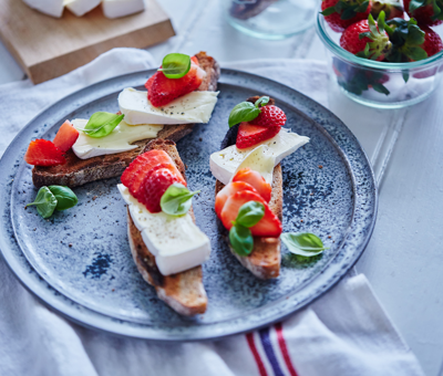 Denne oppskriften består av ekte sommer – bruschetta med jordbær og Castello Hvit er en herlig blanding av sterke farger. Jordbær rett fra hagen, kremet hvitmuggost, basilikum og litt olivenolje kommer sammen for å skape et bilde av jevn konsistens og søte smaker.